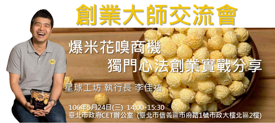 從鑽研玉米品種、爆米花的技巧、瓦斯爐與原料開始,到開業後緊接面臨的課題如:調味配方、市場開發、財務分析、海外通路等,創業彷彿就是一次又一次的越過山丘。為了使更多創業者越過事業的難關,臺北市創業服務辦公室特邀請星球工坊執行長李佳祐,於5/24日(三)下午兩點舉辦的創業大師交流會中分享他的爆米花人生。想了解要如何解決創業過程中的糾結、如何找出產品的利基、從零到一又該具備甚麼樣的心理素質,歡迎報名創業大師交流會來找答案。
